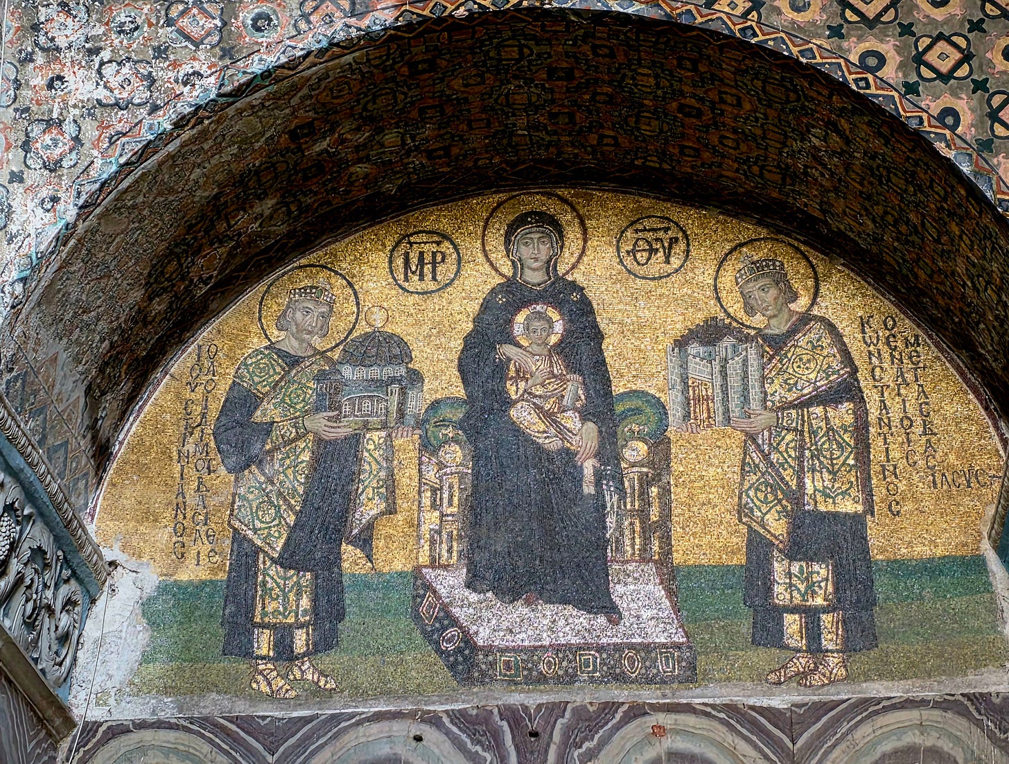 The Hagia sits in the center of the old city section of what is now called Istanbul. But of course, the city did not always have this name. It was called Byzantium in ancient times. It came to be called Constantinople after the Roman Emperor Constantine, in one of the most important acts in history, converted first himself and then the empire from pagan to Christian and then decided to make Byzantium his new capitol (instead of Rome). The renamed city quickly became not only the center of the Roman Empire but also the center of Christianity, for the empire and the church were now wed.