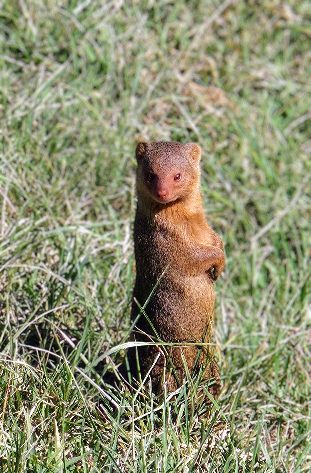 I did happen to see one creature who was new to me: a dwarf mongoose. A mongoose family patrols the camp, looking for snakes. Look how cute it is: